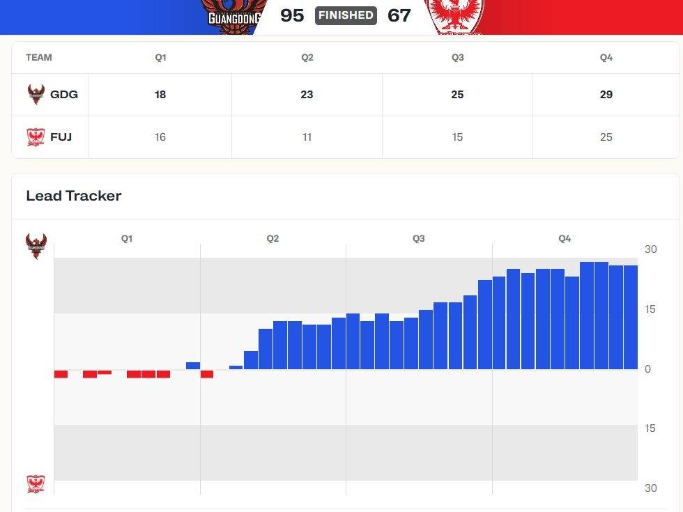 第三节,两队形成短暂的均势到51-37后,广东再次发力打出15-4的攻击波后已经领先24分,比分来到66-42。第四节对手开局追到82-57后,广东连续得分继续扩大比分到88-59,比赛悬念终结。
