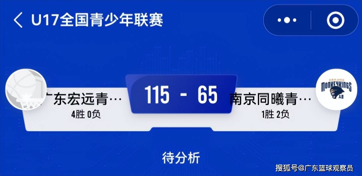 北京时间10月2日,广东宏远U17青年队的小组都已经全部打完,广东宏远U17青年队以115:65的比分战胜了南京同曦U17青年队,大胜了对手50分。