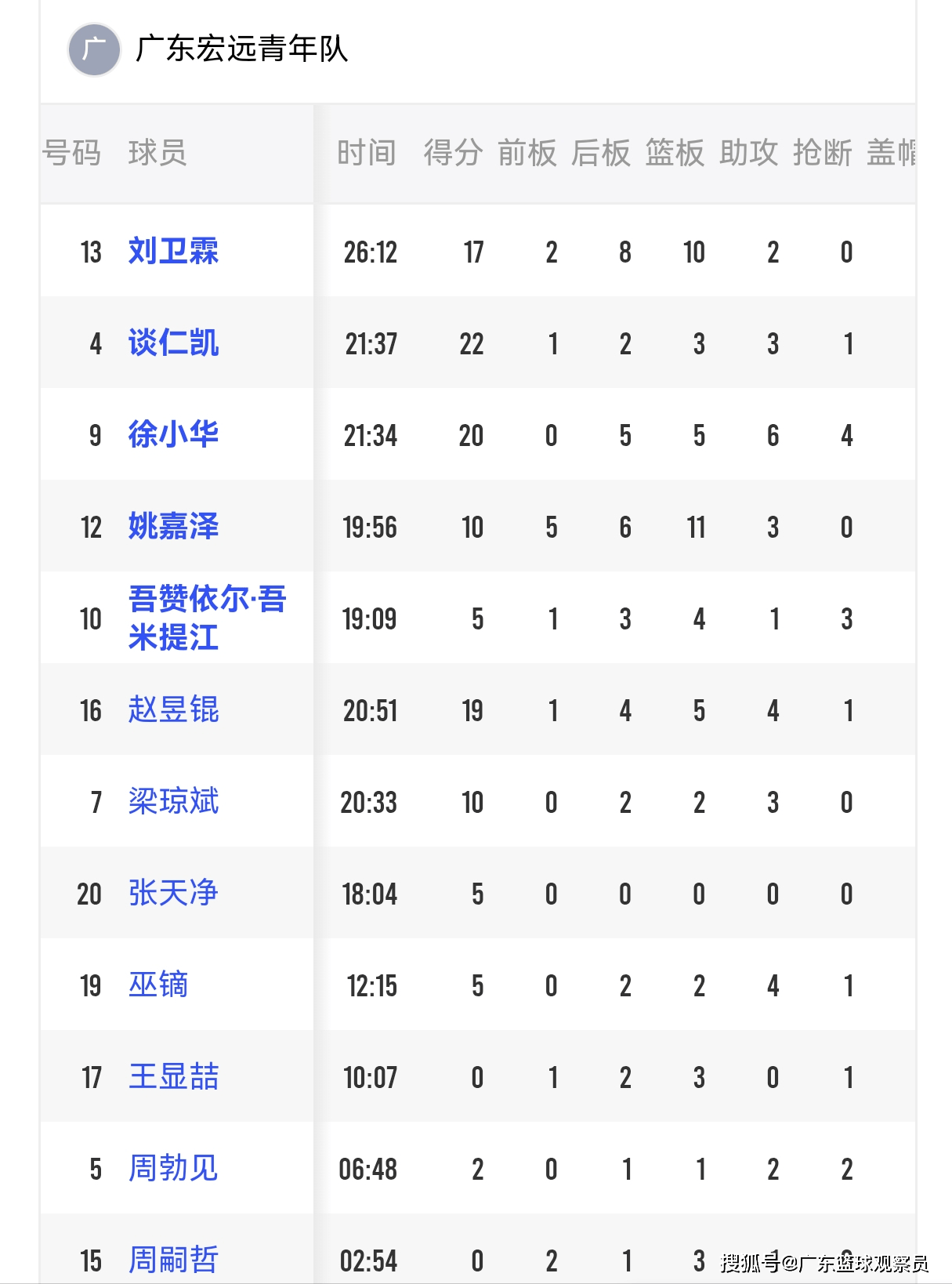 广东宏远U17青年队这场比赛上7人得分上双,12位球员全部都有出场,仅有周嗣哲没有得分进账,其余11位球员仅有得分进账。