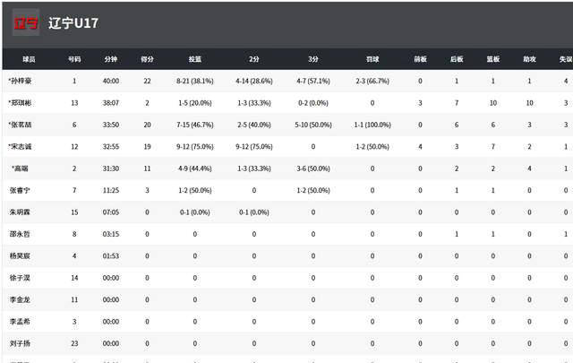本场比赛,辽宁U17男篮有四名球员得分上双,孙梓豪砍下22分,张茗喆贡献20分6篮板,宋志诚得到19分7篮板,高端拿下11分2篮板4助攻,郑琪彬贡献2分10篮板10助攻。