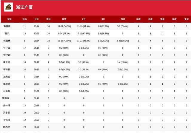 而广厦男篮青年队则有三人得分上双,黄健豪贡献30分8篮板,朝乐拿下20分11篮板3助攻,陈昱休贡献28分7篮板9助攻。