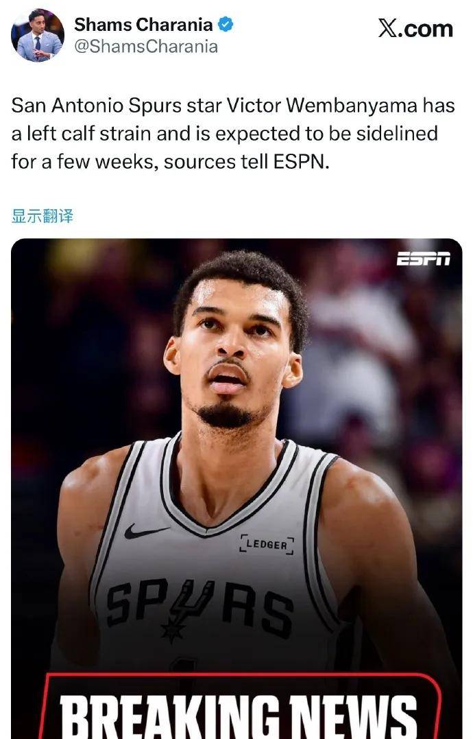 2025-11-22CBA,中国男子篮球职业联赛,CBA赛程,CBA直播,CBA比分,CBA投注/提供CBA最新赛程、实时比分、球队阵容、球员数据及盘口分析,服务中文球迷与篮球数据爱好者,让你全面掌握CBA最新动态。NBA作为世界顶级篮球联赛,再次证明了其水准。这次,文班亚马的“金钟罩”也未能幸免。据Shams的最新报道,文班亚马因左小腿拉伤,将缺席数周。