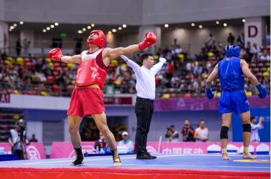 2025年11月16日,河南队选手王少华(左)在比赛中庆祝得分。当日,在广东省湛江市举行的第十五届全国运动会武术散打男子90公斤级决赛中,河南队选手王少华2比0战胜山东队选手翟辰溪,获得冠军。新华社记者 李博 摄