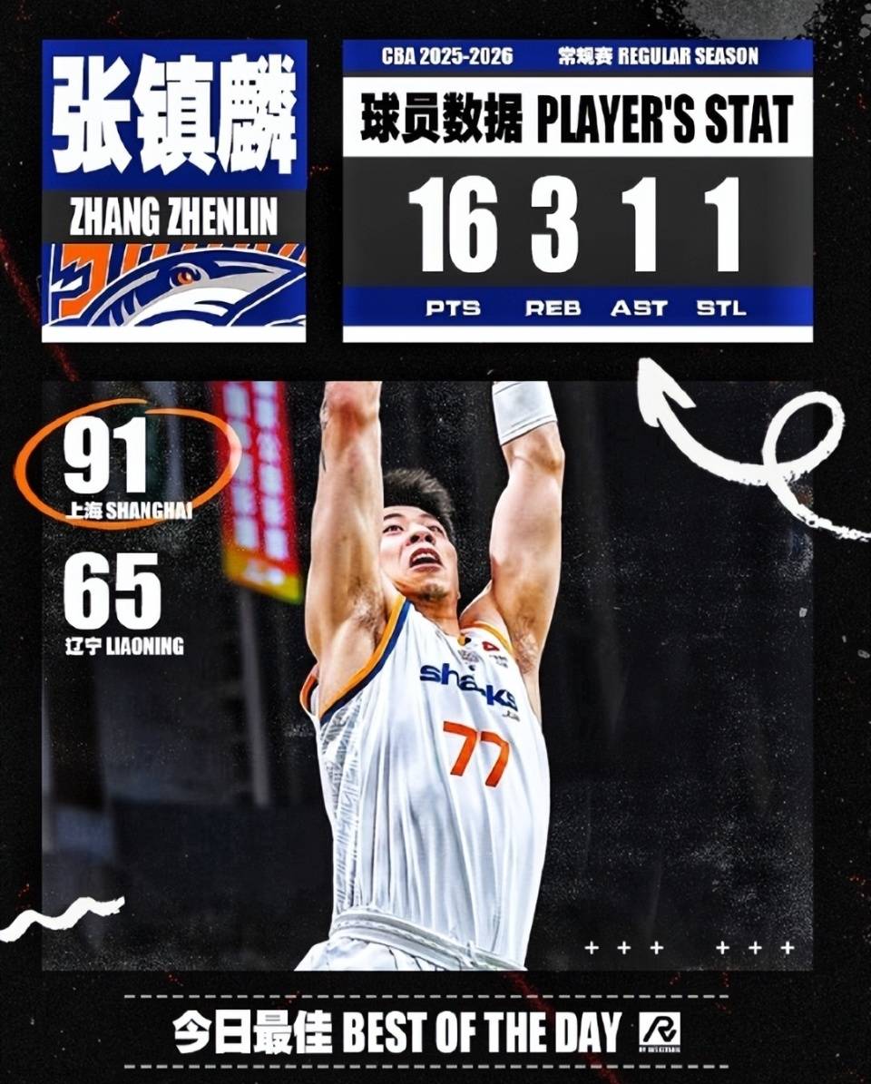 加盟上海男篮后,张镇麟的表现一直较为平淡。但此役面对老东家,他却展现出了不一样的斗志。首发出战31分钟,10投5中,三分球4投1中,罚球5罚全中,高效贡献16分3篮板1助攻1抢断,命中率高达50%,斩获本赛季个人单场第二高分。