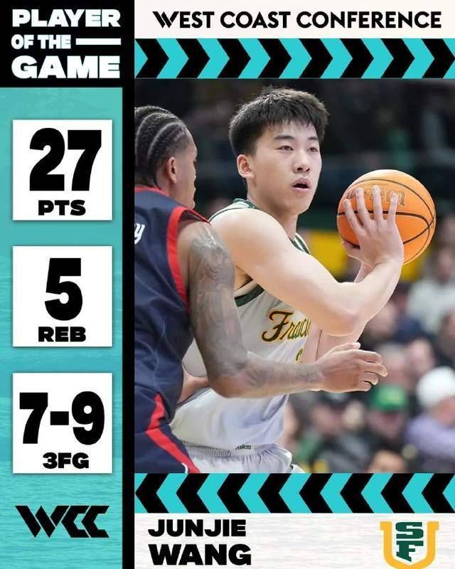2026年1月11日,NCAA的球馆里,旧金山大学赢了佩珀代因大学二十分。王俊杰打了三十三分钟,出手十四次,进了十个球。最吓人的是三分线外,他投了九个,进了七个。二十七分,五个篮板,这是他到美国打球以来的最高分。