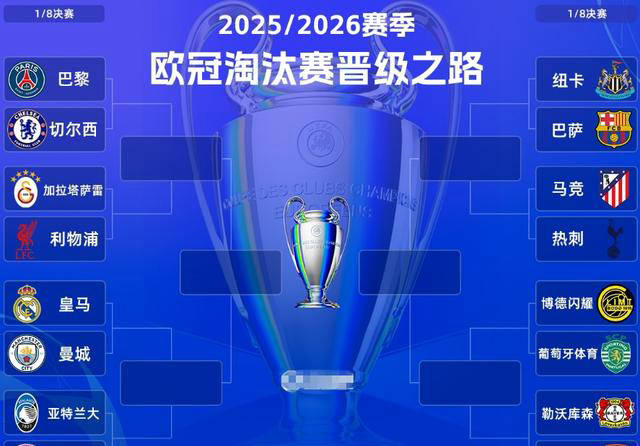 2026-02-28CBA,中国男子篮球职业联赛,CBA赛程,CBA直播,CBA比分,CBA投注/提供CBA最新赛程、实时比分、球队阵容、球员数据及盘口分析,服务中文球迷与篮球数据爱好者,让你全面掌握CBA最新动态。北京时间2026年2月27日晚,2025-26赛季欧洲冠军联赛淘汰赛抽签结果出炉,1/8决赛的全部对阵正式确认。本次抽签中,阿森纳收获上上签,将在首轮面对德国劲旅勒沃库森,且处于下半区,前景看好。值得一提的是,卫冕冠军曼城和皇马这两强连续第五年在淘汰赛阶段相逢,再次展开激烈较量。而巴黎圣日耳曼则将与切尔西重演去年世俱杯决赛的对决,为本赛季增添话题。