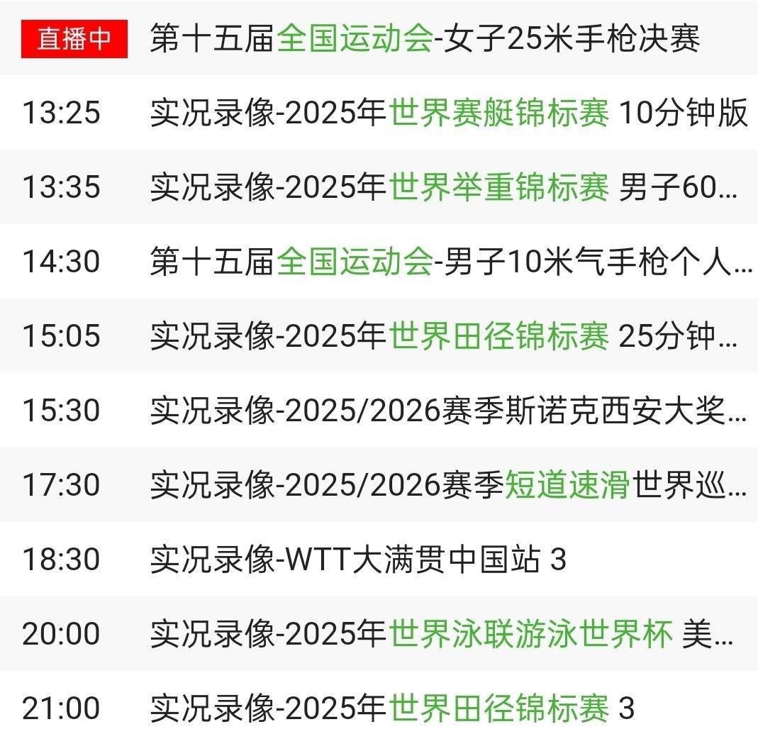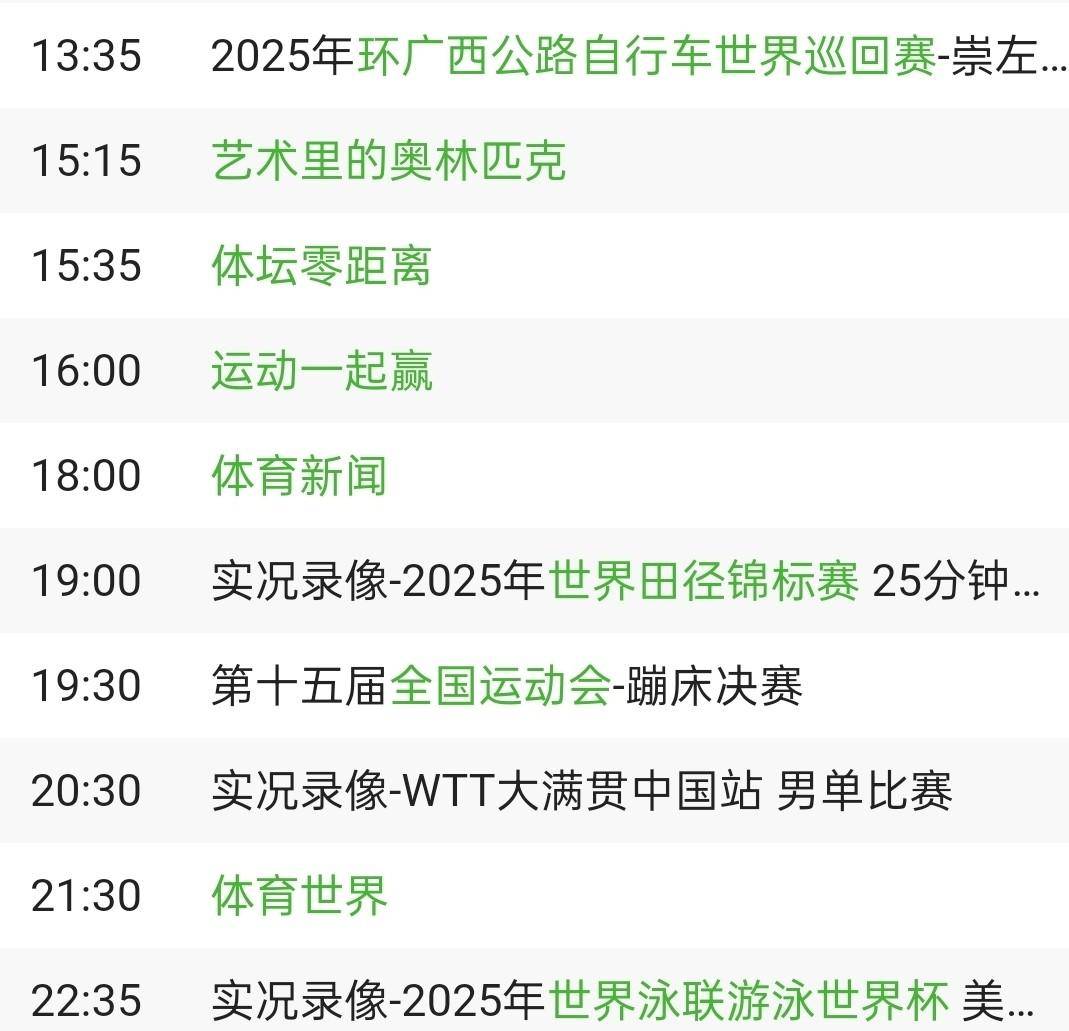 10月15日的CCTV5节目从清晨的《顶级赛事-围棋》开始,涵盖了篮球、足球、自行车等多个体育项目。 当天的重点直播赛事包括上午10点的NBA季前赛和下午13点35分开始的2025年环广西公路自行车世界巡回赛崇左-靖西赛段。