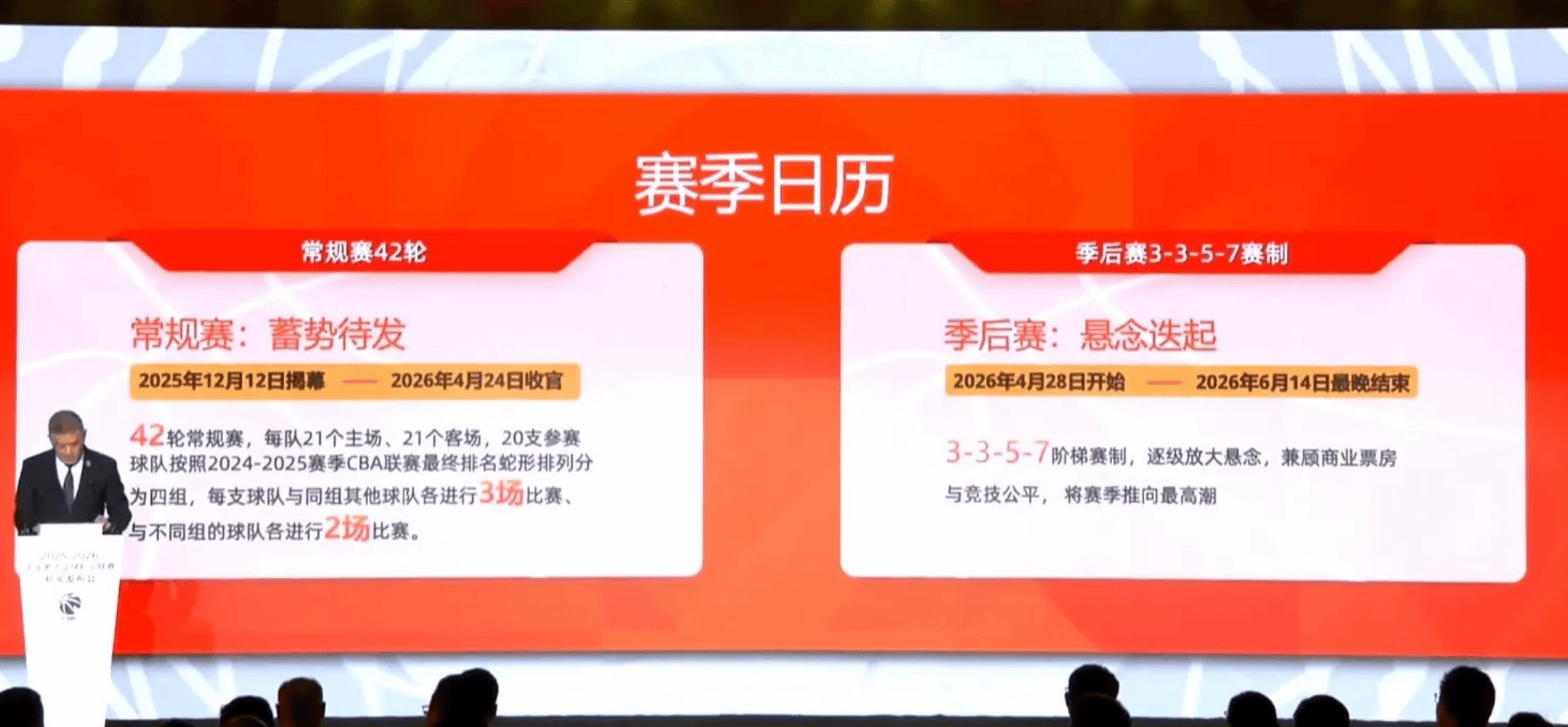 新赛季CBA常规赛将于12月12日正式开始,季后赛实行3-3-5-7的赛制,所有比赛最晚会在2026年6月14日结束。新赛季的CBA全明星周末也确定在浙江省诸暨市的西施篮球中心进行,时间是2026年3月6日至8日。