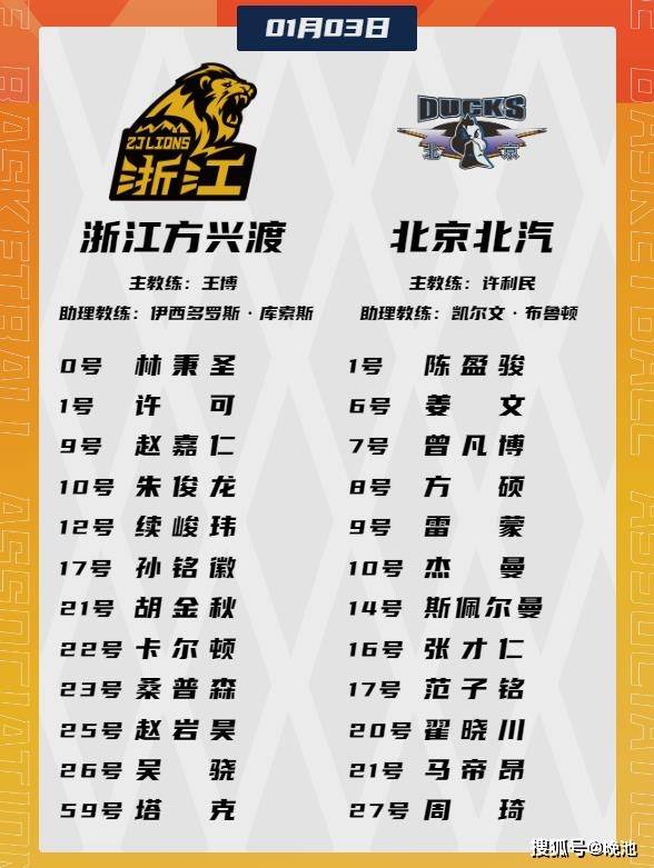 2026-01-03CBA,中国男子篮球职业联赛,CBA赛程,CBA直播,CBA比分,CBA投注/提供CBA最新赛程、实时比分、球队阵容、球员数据及盘口分析,服务中文球迷与篮球数据爱好者,让你全面掌握CBA最新动态。CBA浙江广厦VS北京首钢名单出炉,周琦+孙铭徽等中国男篮国手出战,CCTV5直播