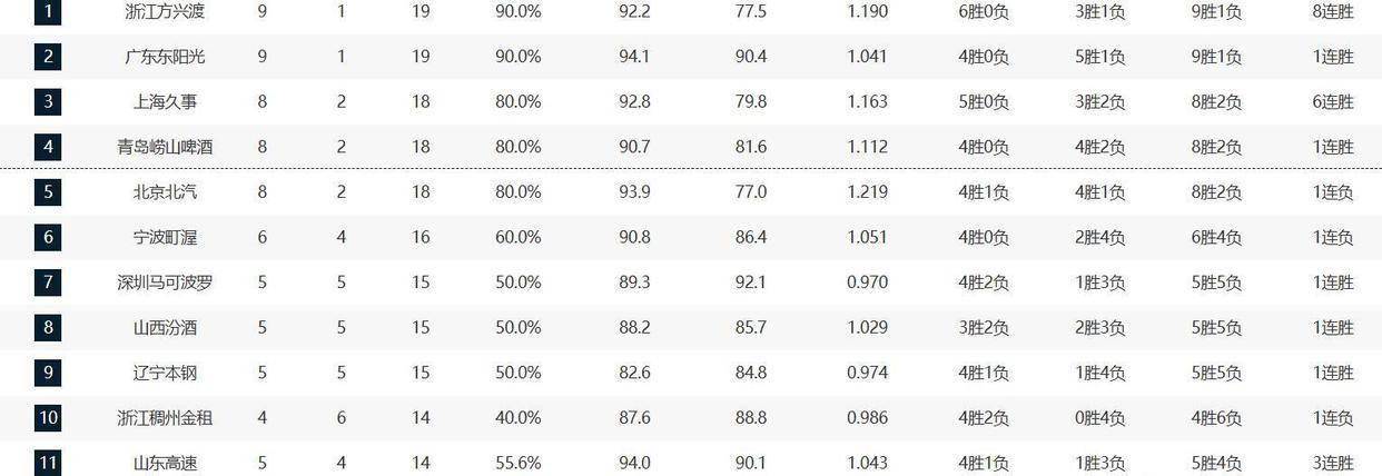 但要说今晚真正压轴的大戏,那必须是晚上黄金时间开球的上海久事对阵浙江广厦。 上海源深体育馆,今晚注定爆满。 一边是势头正盛、豪取六连胜的上海大鲨鱼,另一边是王者之气尽显、已经八连胜的卫冕冠军浙江广厦。 上海队8胜2负,广厦9胜1负,这场球的胜负,直接关系到榜首会不会易主,也会影响青岛那边的排名。