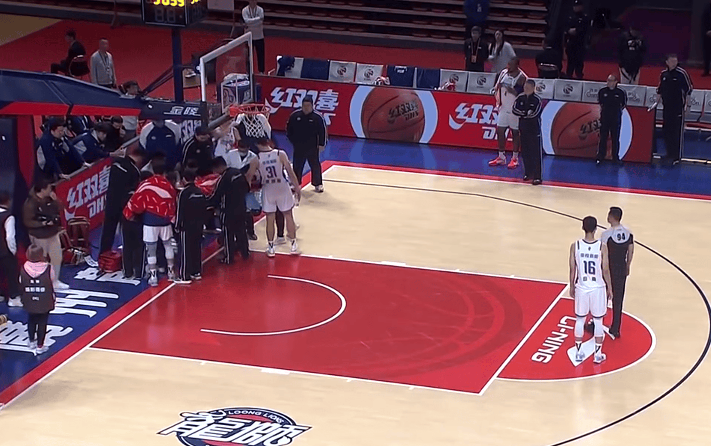 另外一场比赛,天津男篮98-93险胜广州男篮。赖俊豪撞到广告牌上,被担架车推出去了。