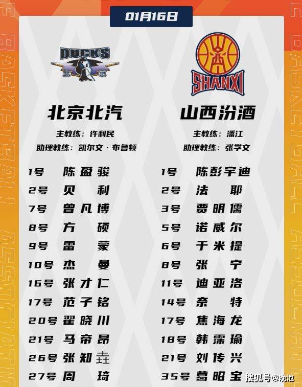 2026-01-16CBA,中国男子篮球职业联赛,CBA赛程,CBA直播,CBA比分,CBA投注/提供CBA最新赛程、实时比分、球队阵容、球员数据及盘口分析,服务中文球迷与篮球数据爱好者,让你全面掌握CBA最新动态。CBA北京首钢VS山西男篮名单出炉,周琦+陈盈骏领衔出战,赵睿+原帅缺阵,CCTV5+直播